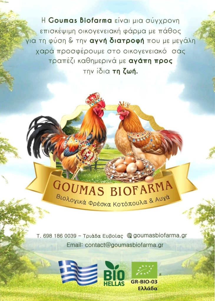 Η GOUMAS BIOFARMA είναι μια σύγχρονη οικογενειακή φάρμα με πάθος για την φύση και την αγνή διατροφή, Πιστοποιημένα από την ‘BioHellas’ , Ινστιτούτο Ελέγχου Βιολογικών Προϊόντων Α.Ε